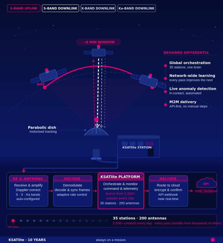 Behind every pass is an orchestration layer that coordinates antennas, radios, network routing, mission schedules, and monitoring infrastructure in real time, across a global KSATlite network of nearly 35 stations and 200 antennas. By the time the satellite rises above the horizon, every component is already configured and waiting.